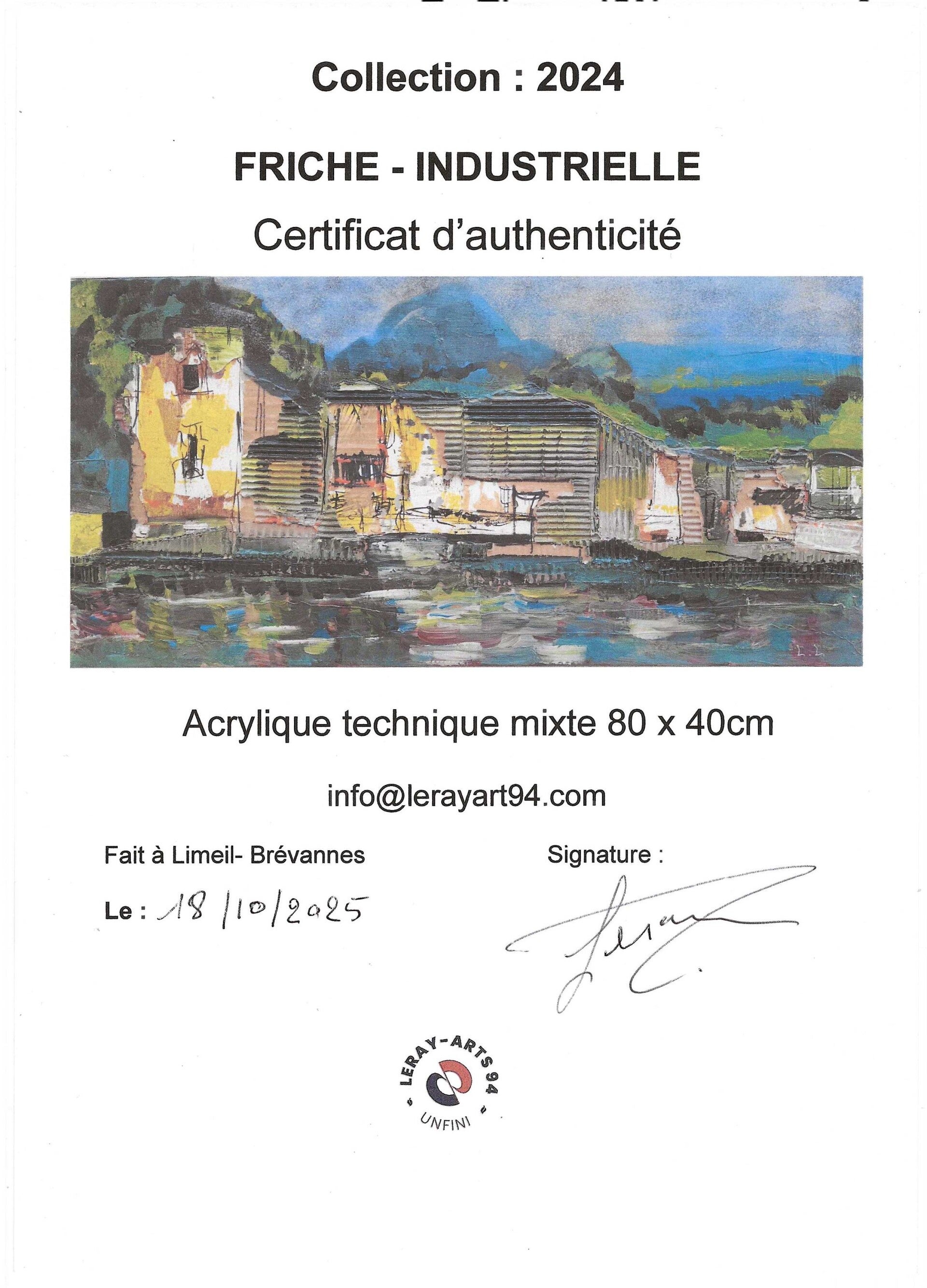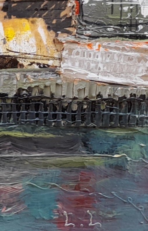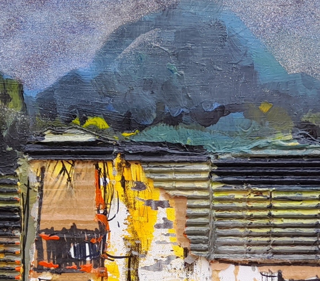Acrylique avec une technique mixte , un mixte de cartons et peinture constitue les bâtiments , le ciel avec une projection de paillettes crée une profondeur et une vision nocturne Dimensions 80x40 cm oeuvre unique